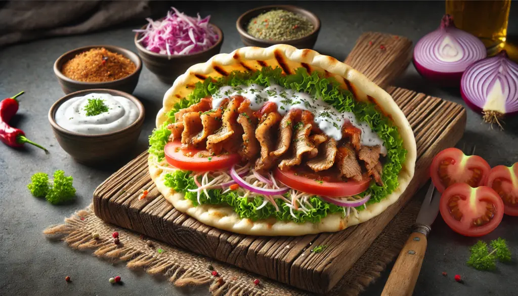 Shawarma Sandwich, Knoblauchsauce, Salzgurken, Salat und Reis o. Pommes (A,C,6)